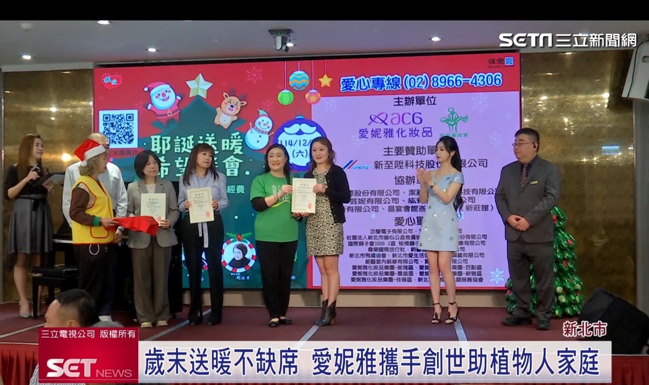 日前,愛妮雅化妝品集團攜手創世基金會板橋院舉辦「耶誕送暖愛心餐會」,透過慈善募款、公益拍賣及音樂饗宴,不僅為植物人家庭籌募照護經費,更希望在寒冬中注入一股暖流,以實際行動實踐「取之社會,用之社會」的企業精神。